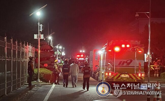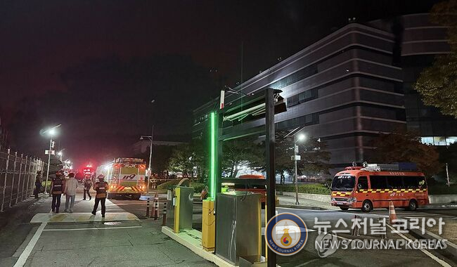불이 난 국가정보자원관리원 (연합뉴스=뉴스저널코리아) = 26일 오후 8시 20분께 대전 유성구 화암동 국가정보자원관리원에서 리튬배터리 화재가 발생, 소방당국이 진화작업을 벌이고 있다. 2025.9.27
