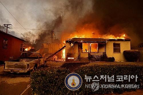 1월 LA산불때 불타는 가옥 [로이터 연합뉴스=뉴스저널코리아. 재판매 및 DB 금지]