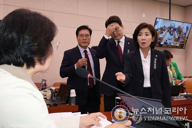 추미애 위원장에게 항의하는 국민의힘 10월 16일 서울 여의도 국회에서 열린 감사원 등에 대한 법제사법위원회 국정감사에서 국민의힘 의원들이 추미애 위원장의 회의 진행 방식에 대해 항의하고 있다. [ⓒ연합뉴스=뉴스저널코리아]