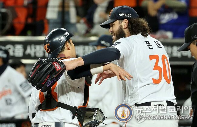 (ⓒ연합뉴스) = 24일 대전 한화생명 볼파크에서 열린 2025 프로야구 KBO리그 포스트시즌 플레이오프 5차전 삼성 라이온즈와 한화 이글스의 경기. 3회초 수비를 무실점으로 막은 한화 폰세가 포수 최재훈에게 고마움을 표시하고 있다. 2025.10.24