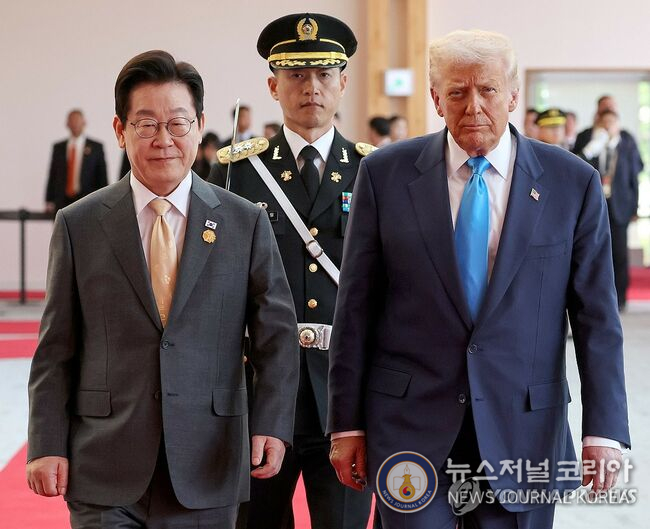 이재명 대통령과 도널드 트럼프 미국 대통령이 29일 경북 경주박물관에서 열린 공식 환영식에서 의장대를 사열하고 있다. 2025.10.29 [대통령실통신사진기자단]