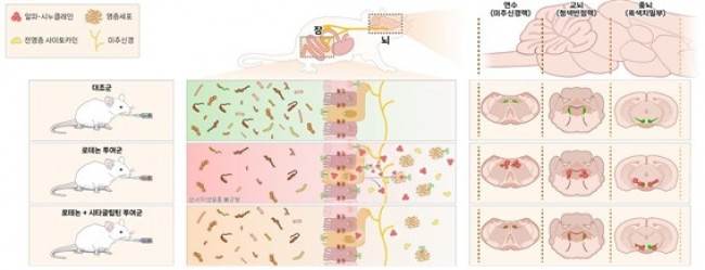 경구 로테논을 투여한 동물모델에서 장내 염증 반응을 확인할 수 있었다. 알파-시누클레인 단백질이 장 상피세포와 신경을 따라 이동해 중뇌까지 퍼진다. 시타글립틴 병용 투여 시 이러한 장내 염증 반응과 더불어 단백질 축적이 줄어 뇌로의 알파-시누클레인 확산과 도파민 신경세포 손상을 억제했다. 2025.11.04. [세브란스병원 제공. 재판매 및 DB 금지]