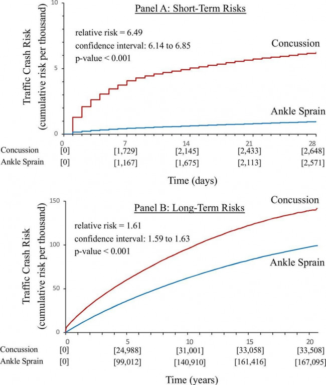 연구팀은 이는 뇌진탕 그룹 경우 연간 교통사고가 1천명당 10.58건, 발목 염좌 그룹은 1천명당 6.18건 발생한 것이라며 이런 차이는 뇌진탕 후 교통사고 위험이 상대적으로 61% 증가했음을 뜻한다고 설명했다.