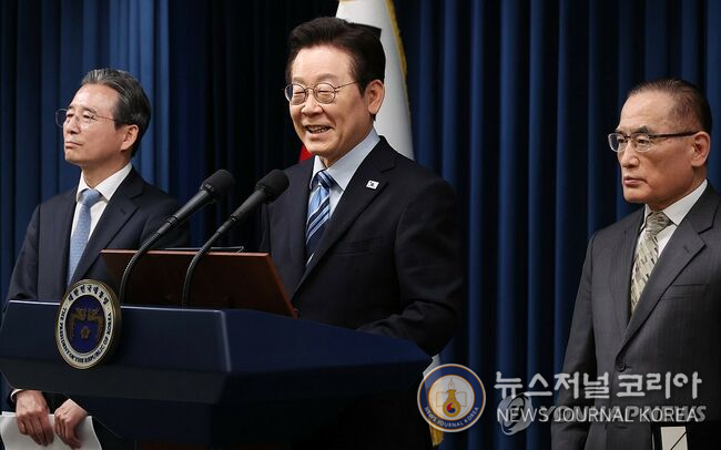 왼쪽부터 김용범 정책실장, 이재명 대통령, 위성락 국가안보실장. 2025.11.14