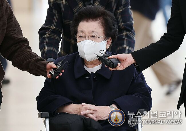 이배용 전 국교위원장, 특검 재출석 (ⓒ연합뉴스=뉴스저널코리아) = 휠체어를 탄 이배용 전 국가교육위원장이 13일 서울 광화문 KT 빌딩에 마련된 김건희특검 사무실로 재출석하고 있다. 2025.11.13