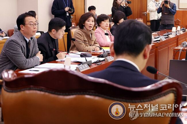 '내란 전담 재판부' 설치법 추진 항의하는 나경원 의원 (ⓒ연합뉴스=뉴스저널코리아) = 국민의힘 나경원 의원이 1일 서울 여의도 국회 법제사법위원회에서 열린 법안심사제1소위원회의에서 여당 주도의 '내란 전담 재판부' 설치법 논의에 반대하며 더불어민주당 소속 김용민 소위원장에게 항의하고 있다. 2025.12.1